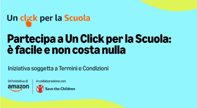 Anche quest’anno la nostra Scuola ha deciso di partecipare all’iniziativa “Un click per la Scuola” per raccogliere crediti virtuali da utilizzare per ottenere prodotti e strumenti utili per le nostre classi. Anche tu puoi sostenere la raccolta dei crediti virtuali attraverso i tuoi acquisti su Amazon.it